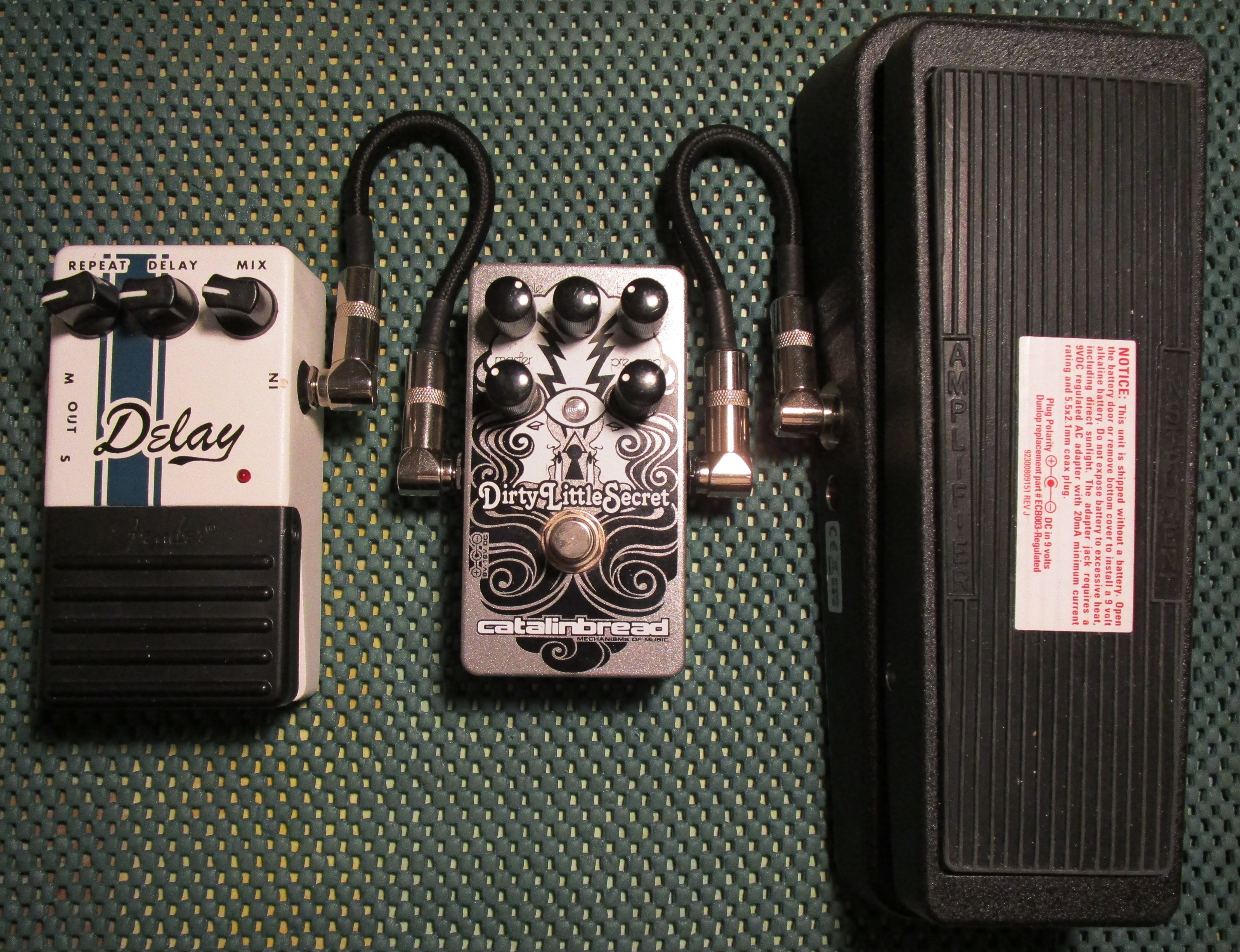 While playing at home one day, we ran an Epiphone® DOT, refitted with a Seymour Duncan ‘59 humbucker at the neck and a Trembucker in the bridge, into a small five line Behringer mixer, using headphones. With a Dunlop® Cry Baby Wah, Catalinbread® Dirty Little Secret and Fender® delay pedal, in that order, we still needed a bit of reverb to get the tone right for the beginning riff from Zeppelin’s “Dazed and Confused,” before the upper harmonics part occurs. That’s when we dialed in some reverb by lowering the repeat, delay and volume settings on the Fender® stompbox.