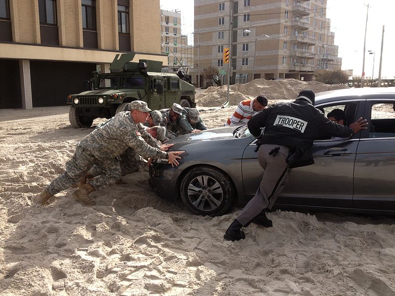 People helping people. NY Army National Guard and others assist a motorist in Long Beach after Sandy. Creative commons attribution – N.Y. National Guard, public domain as a work of the Federal Govt.