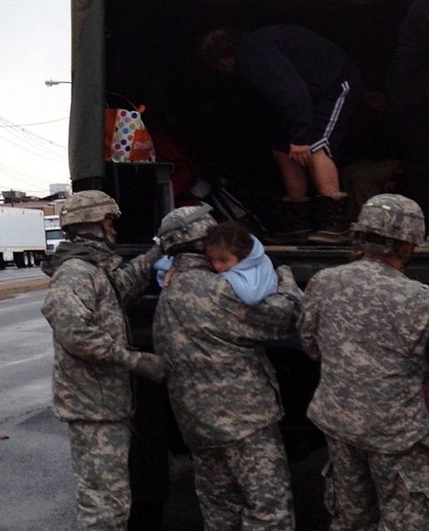 Soldiers from the 1st BN, 258th Field Artillery assist families following Hurricane Sandy. CC attribution NY Natl. Guard, public domain as a work of the U.S. Federal Govt. but does not suggest endorsement.